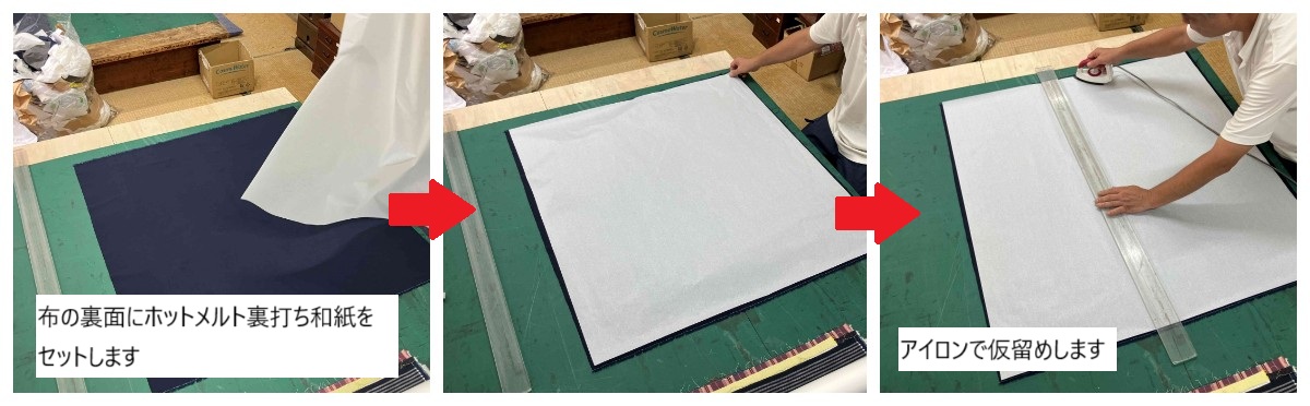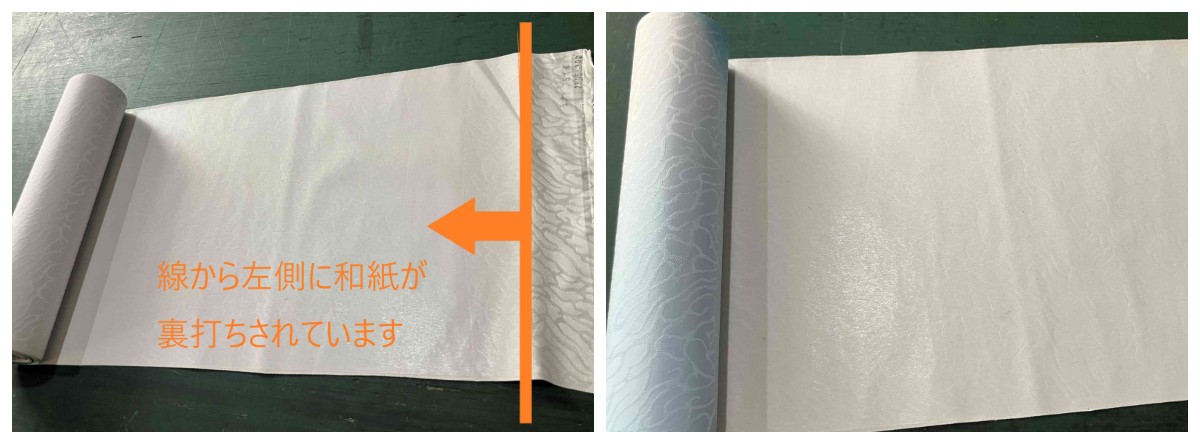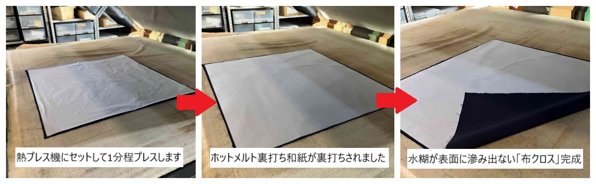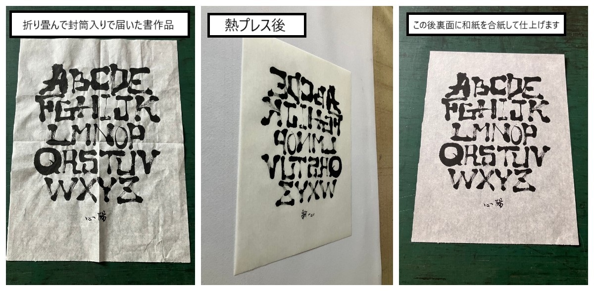 書道作品・布への裏打ち加工、即日仕上げ可能です!! ●書作品の裏打ち ●布の裏打ち ●反物の状態もままでも裏打ち可能です!! ◎書道作品、生地(布)への裏打ち加工、 その場で仕上げることが出来ます!!(要事前相談) 生地(布)へ裏打ち加工を施すと、糊を通さなくなるので、一般に売られている手拭いやカーテン生地等を、上製本の表紙や紙箱等へ貼り込むことも、壁クロスとして壁に貼ることも出来るようになります。 ◎弊社の裏打ち方法は、大型熱プレス機を使用する 『ドライマウント(乾式裏打ち)』です